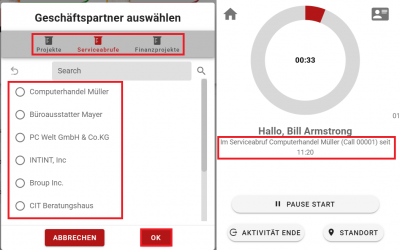 3. Aktivität auswählen (z. B. Projekt, Serviceabruf, Finanzprojekt, Kostenstelle)