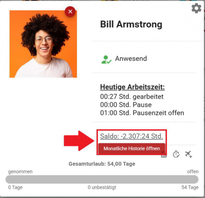 Über das Info-Icon in der digitalen Stechuhr gelangen Sie zu persönlichen Informationen, Historie und Anträgen.