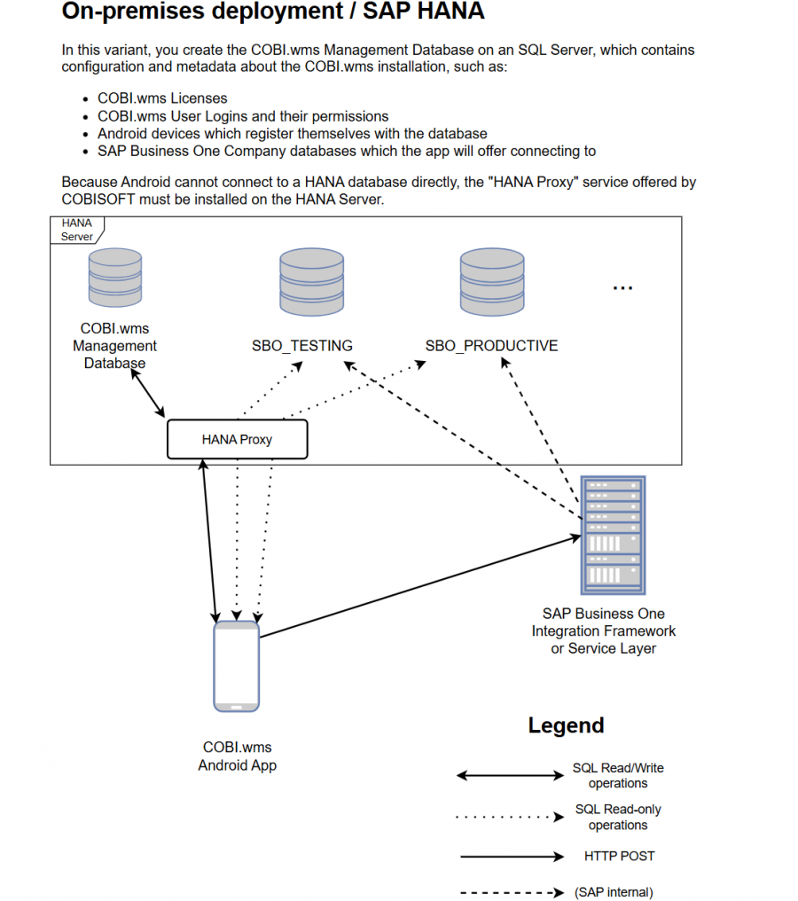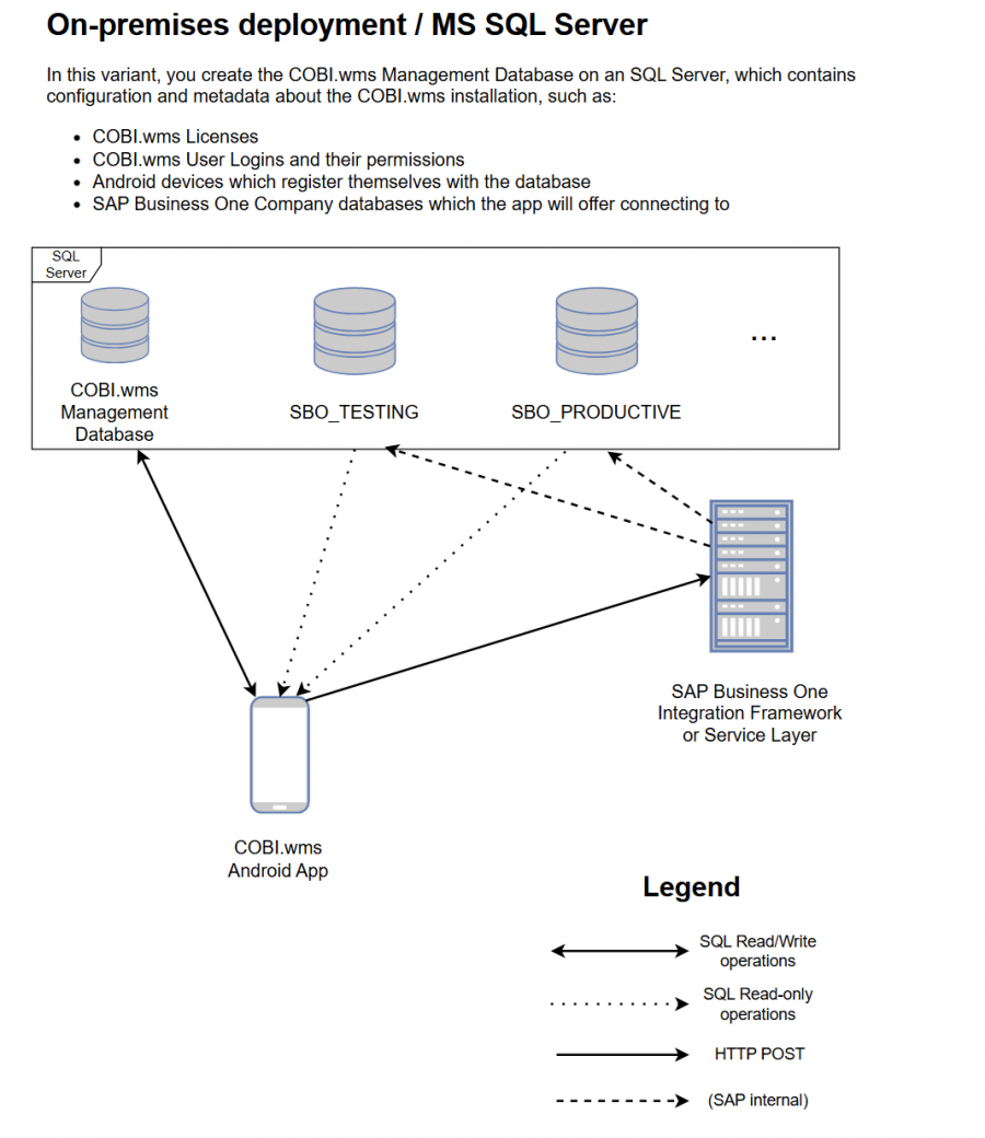 Die folgenden Diagramme helfen dabei, die Architektur von COBI.wms im Hinblick auf die Konfigurationsbereitstellung und die SAP-Business-One-Verbindung besser zu verstehen.