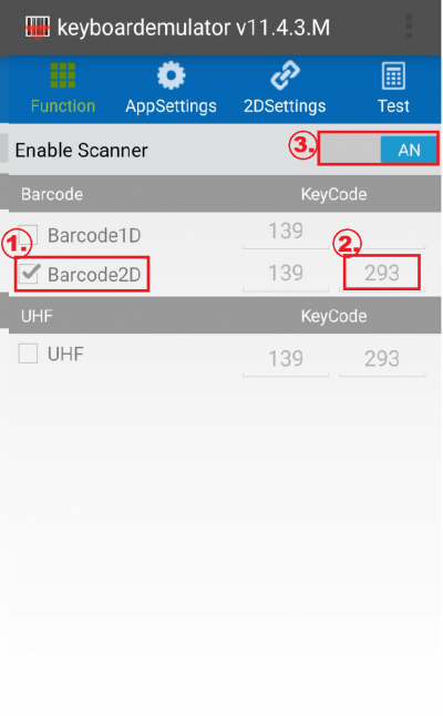 - Function: Scanner aktivieren, Barcode2D aktivieren, KeyCode setzen