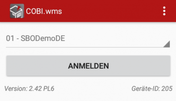Nach dem Start der App wird die Anmeldemaske angezeigt. Hier kann per Drop-Down die Firmendatenbank ausgewählt werden, an welche die App sich verbinden soll.